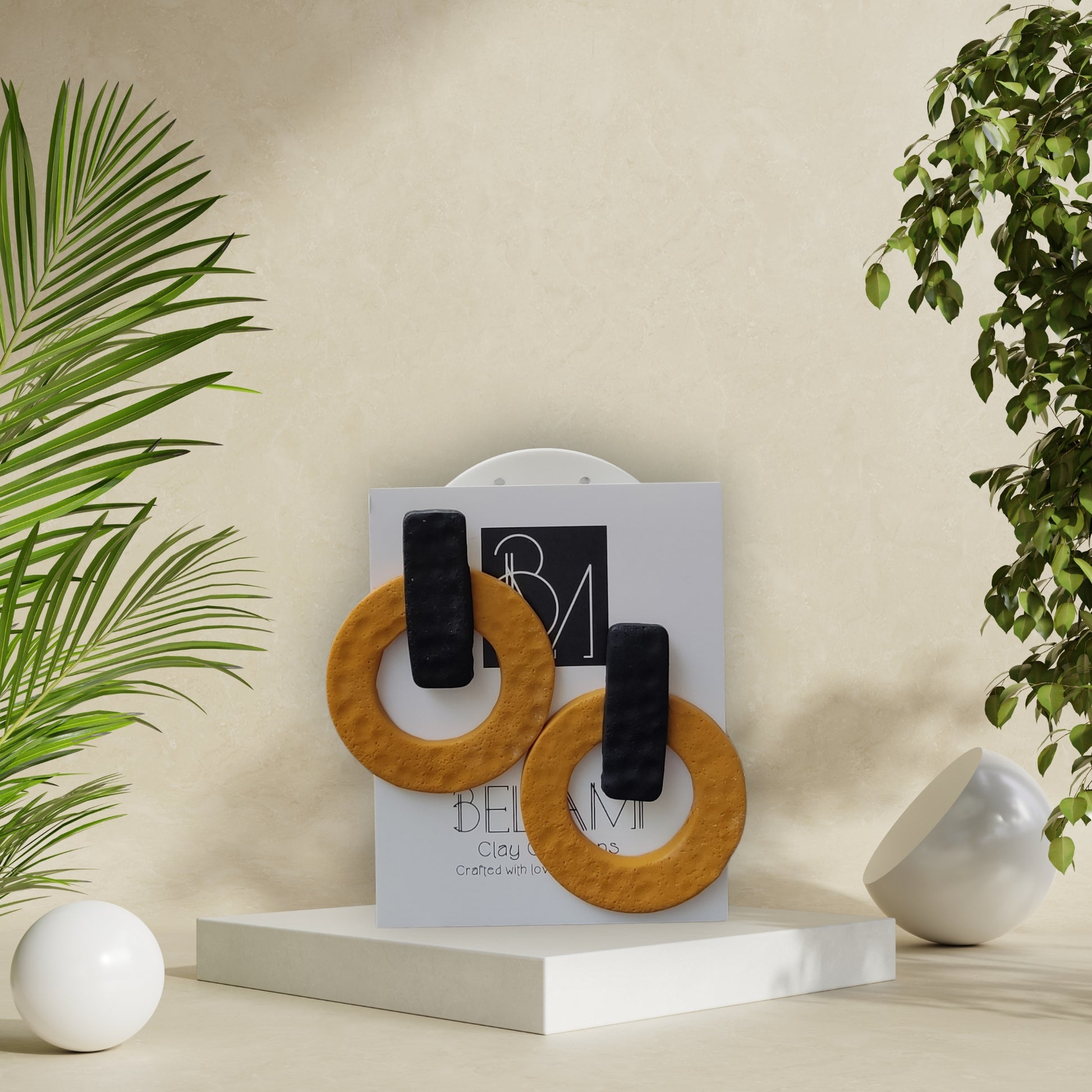The MIDNIGHT SUN earrings combine bold geometry and earthy tones. A matte black vertical base connects to a large mustard-hued hoop, creating contrast and balance. Lightweight and striking, they embody confidence and modern style for Fall–Winter looks.