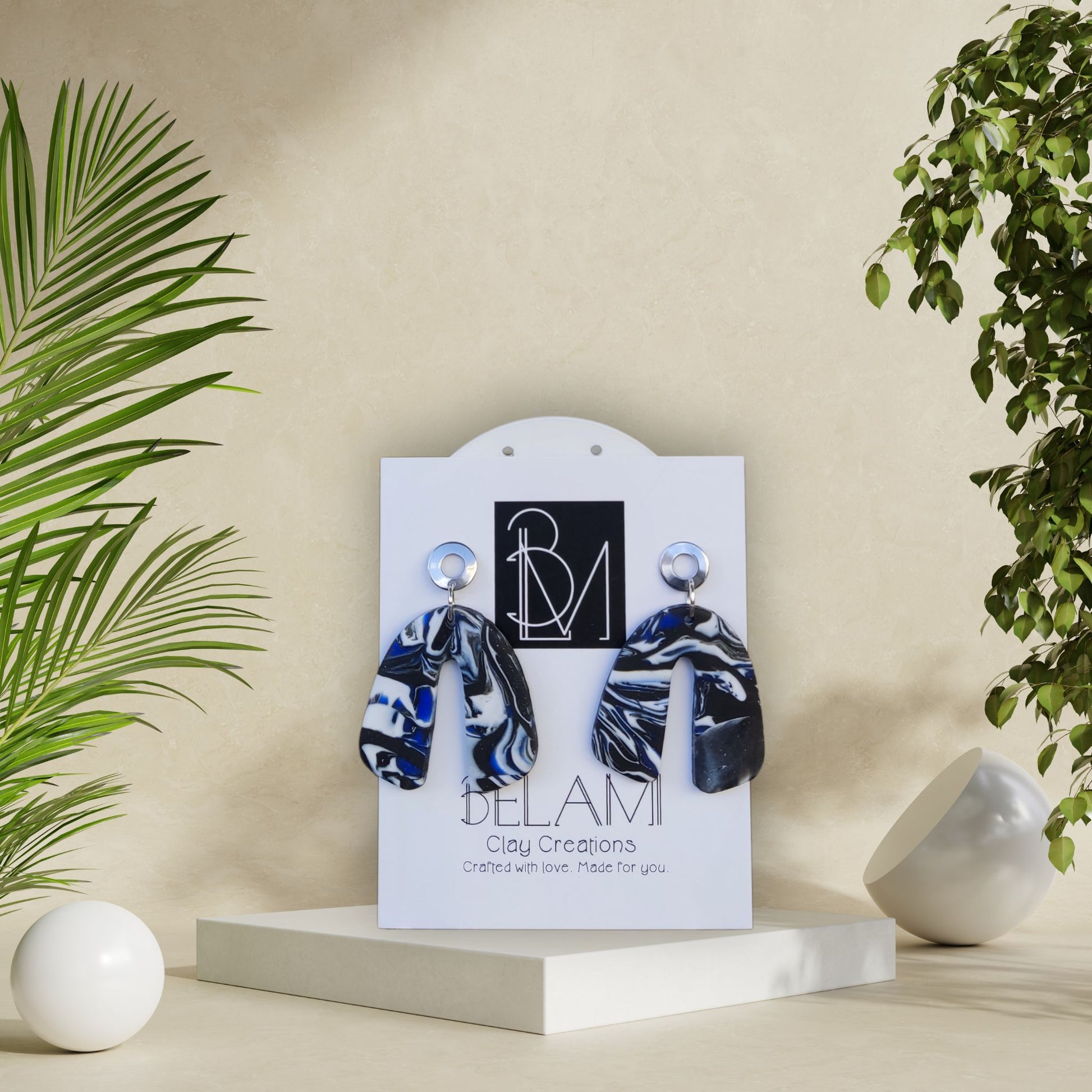 Handmade polymer clay earrings with an expressive abstract shape and bold marble swirl in black, deep blue, and white. Artistic and fluid, these earrings make a statement without shouting. Mounted on silver-tone round studs. Lightweight and sculptural.