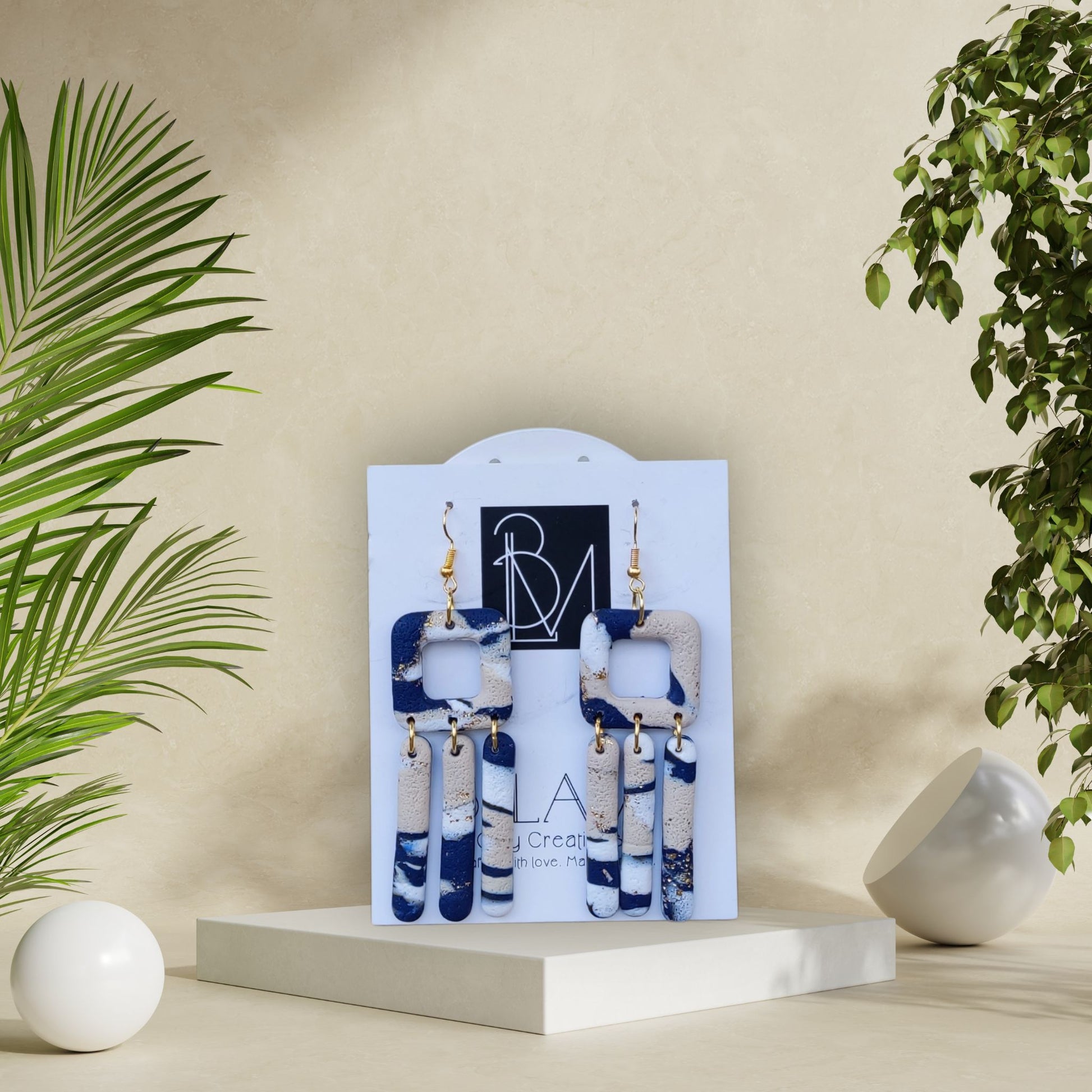 Χειροποίητα σκουλαρίκια από πολυμερικό πηλό με τετράγωνη κορυφή και κάθετες μπάρες. Στροβιλισμός από μπλε, μπεζ, λευκό και χρυσό – εμπνευσμένα από το Αιγαίο και τα φυσικά του στοιχεία. Ελαφριά, με κίνηση και στιλ. Επιχρυσωμένοι γάντζοι από ανοξείδωτο ατσάλι.