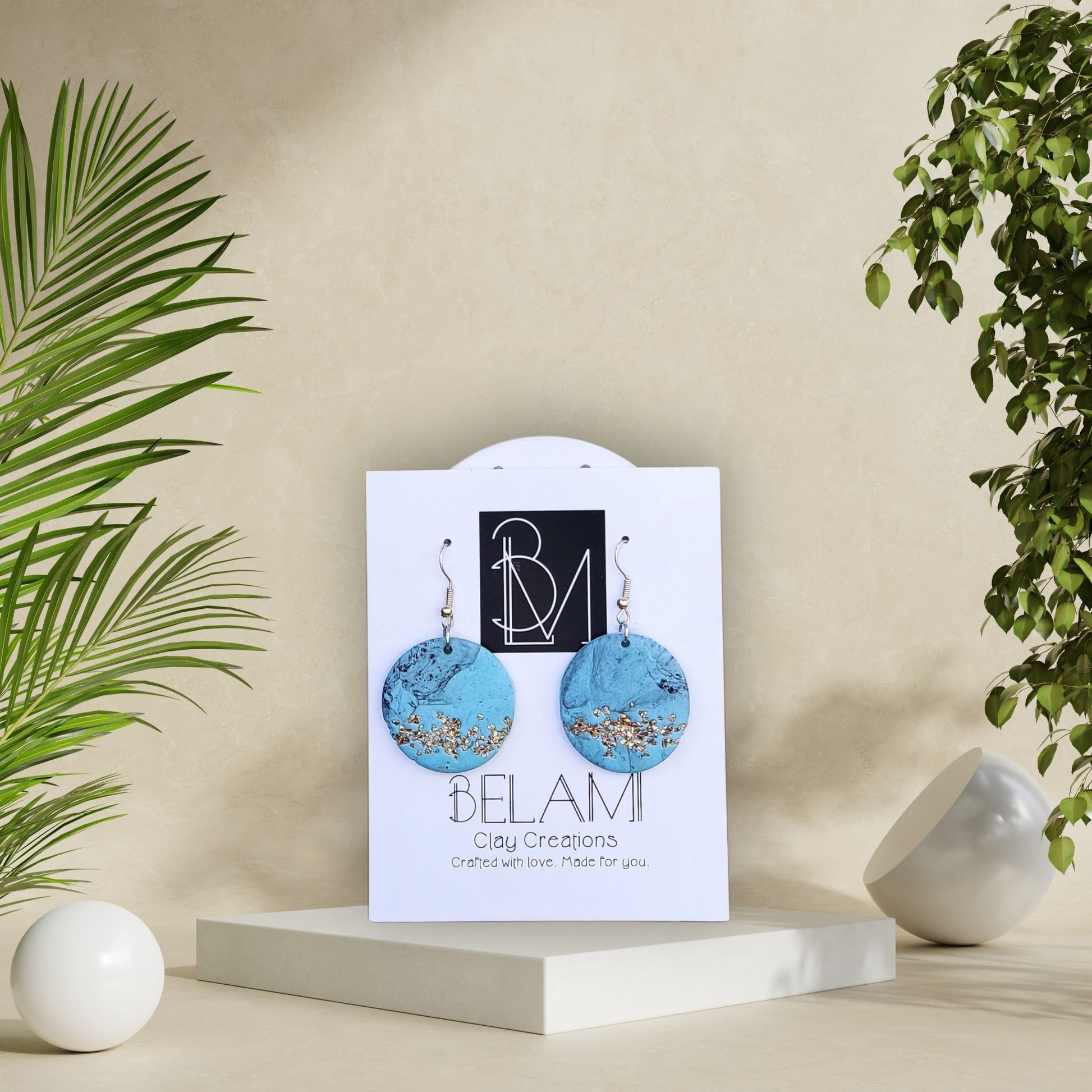 Χειροποίητα σκουλαρίκια από πολυμερικό πηλό, με ανάγλυφη υφή που θυμίζει άνθη, διακοσμημένα με χρυσές λεπτομέρειες πάνω σε δροσερό aqua φόντο. Ένα κομμάτι που μαγνητίζει.