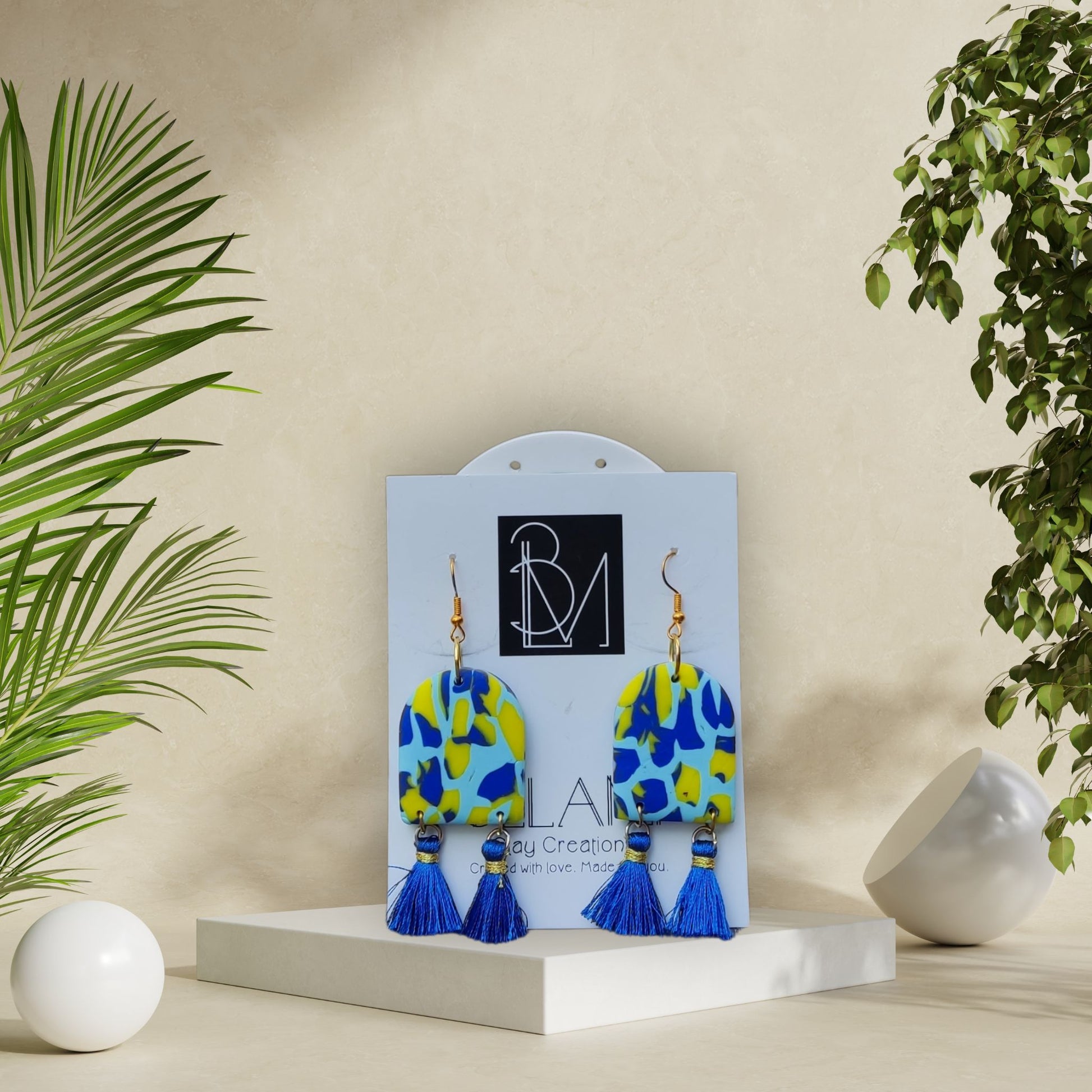 Τολμηρά, καλλιτεχνικά και γεμάτα κίνηση. Αυτά τα boho-inspired σκουλαρίκια συνδυάζουν ζωηρό abstract μίγμα μπλε, κίτρινου και navy με παιχνιδιάρικες φουντίτσες, προσθέτοντας ενέργεια και καλοκαιρινό στυλ στην εμφάνισή σας.