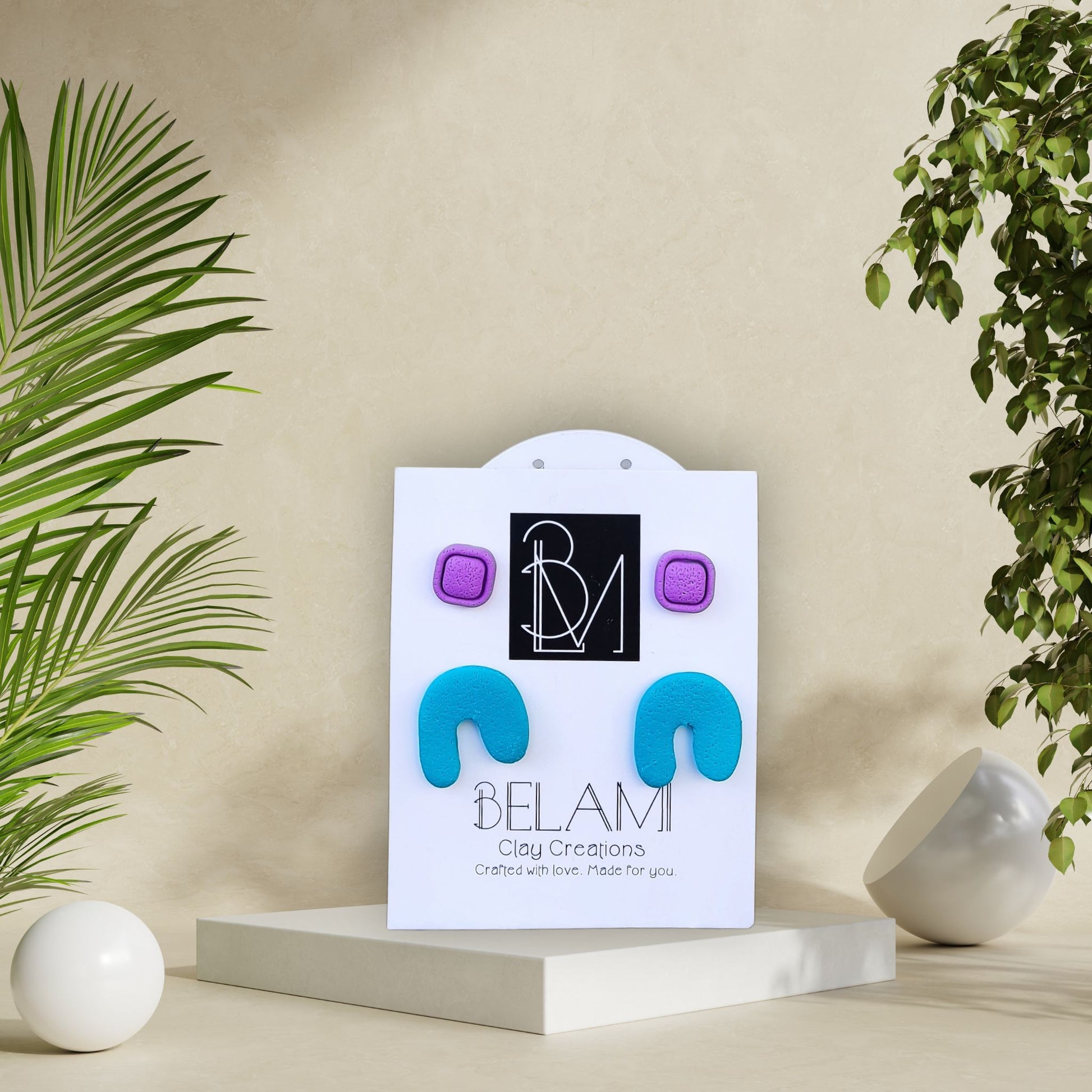 Το combo περιλαμβάνει δύο διαφορετικά ζευγάρια: λιλά τετράγωνα καρφωτά και τιρκουάζ σκουλαρίκια με γλυπτή καμπύλη. Ένα πολύχρωμο σετ για να το φοράς ανάλογα με τη διάθεσή σου.