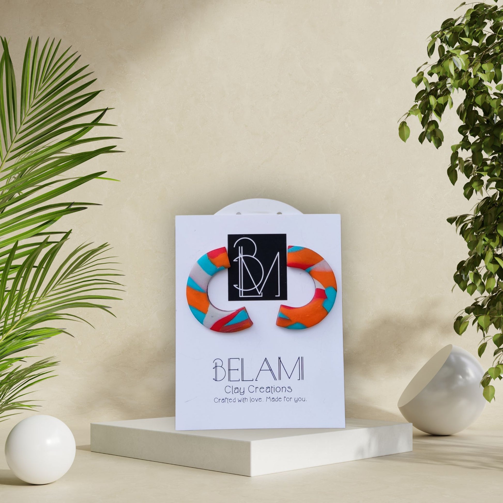 Μια έκρηξη χρωμάτων σε chunky σχήμα! Αυτά τα half-hoops θυμίζουν pop art και καρναβάλι, με swirl σε πορτοκαλί, τιρκουάζ, ροζ και λευκό.