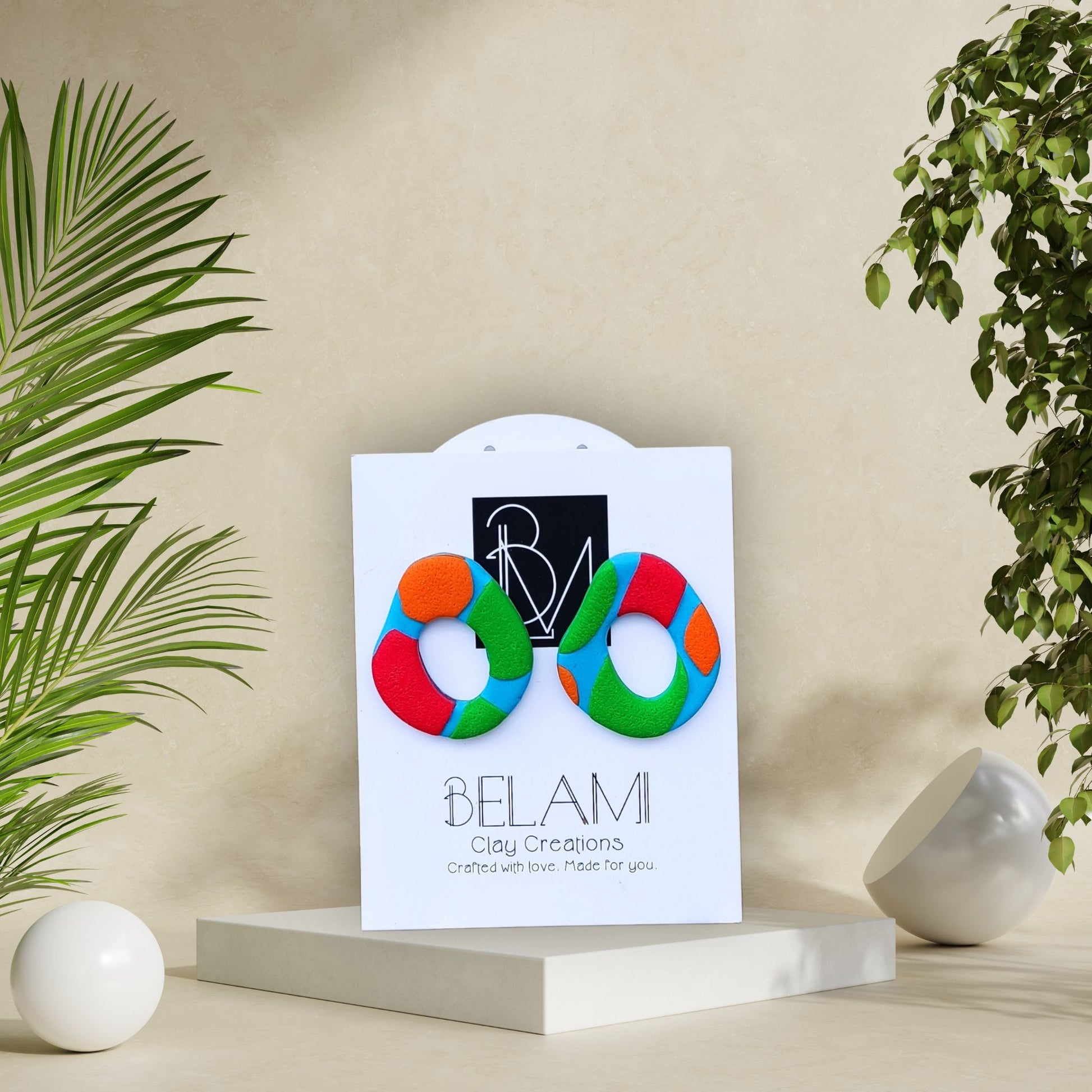 Χειροποίητα σκουλαρίκια από πολυμερικό πηλό σε έντονα, ρετρό κυκλικά σχήματα. Χρώματα σε πράσινο, κόκκινο, μπλε και πορτοκαλί για ένα look που ξεχωρίζει. Ανάλαφρα, παιχνιδιάρικα και γεμάτα vintage διάθεση.