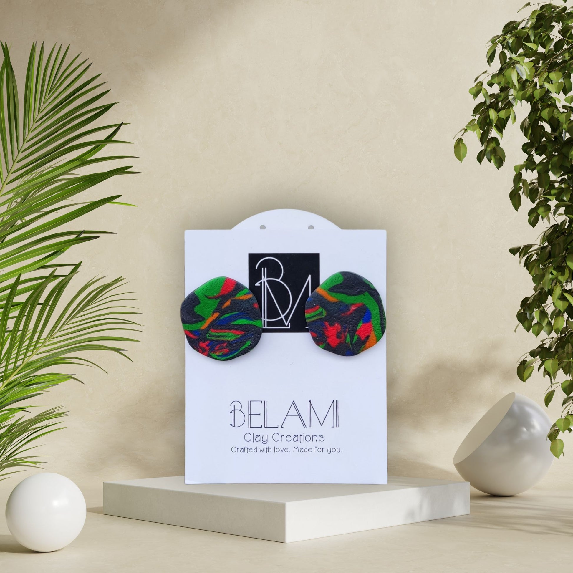 Εντυπωσιακά χειροποίητα σκουλαρίκια από πολυμερικό πηλό, με έντονες δίνες κόκκινου, πράσινου, πορτοκαλί και μωβ πάνω σε σκούρο φόντο. Το αφηρημένο σχέδιο αποπνέει ενέργεια, κίνηση και βάθος — για τολμηρά και ελεύθερα στυλ.