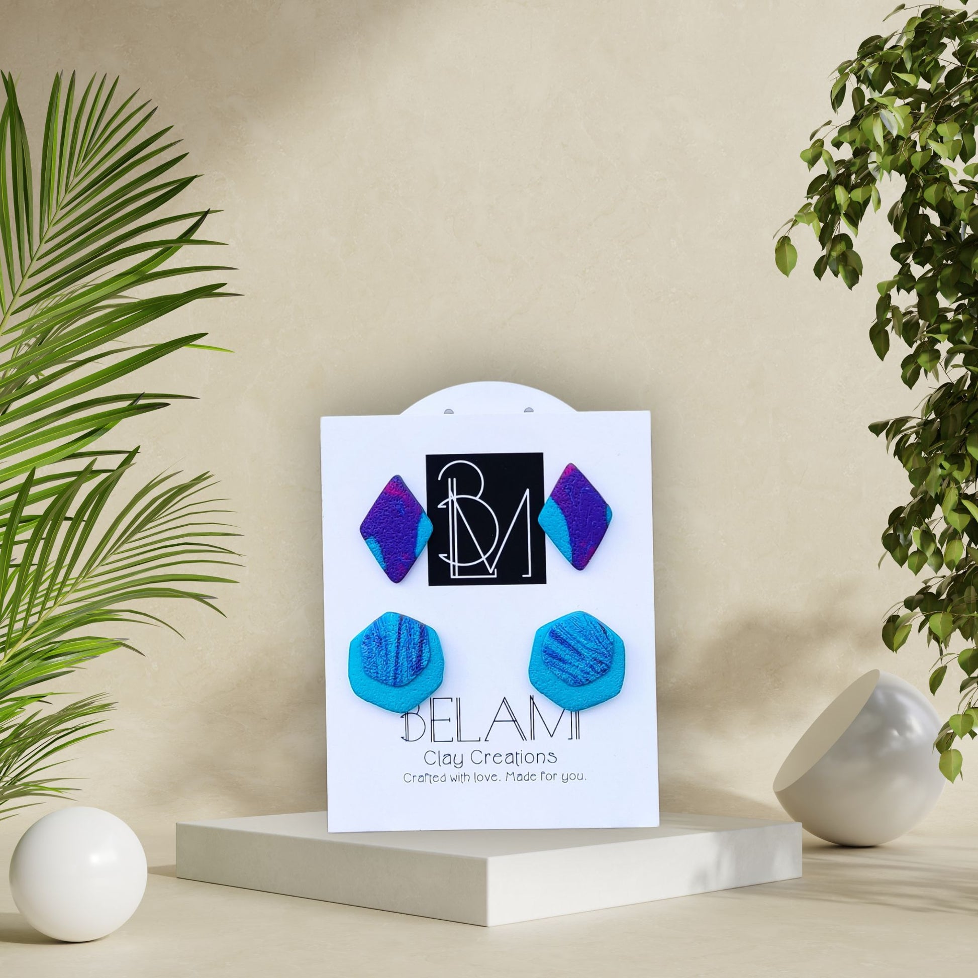 Ένα τολμηρό και παιχνιδιάρικο combo σετ με δύο ξεχωριστά ζευγάρια σκουλαρίκια από πολυμερικό πηλό. Το ένα με ρομβοειδές σχήμα σε μοβ και μπλε αποχρώσεις. Το άλλο εξάγωνο σε τιρκουάζ και ανάγλυφο μπλε.