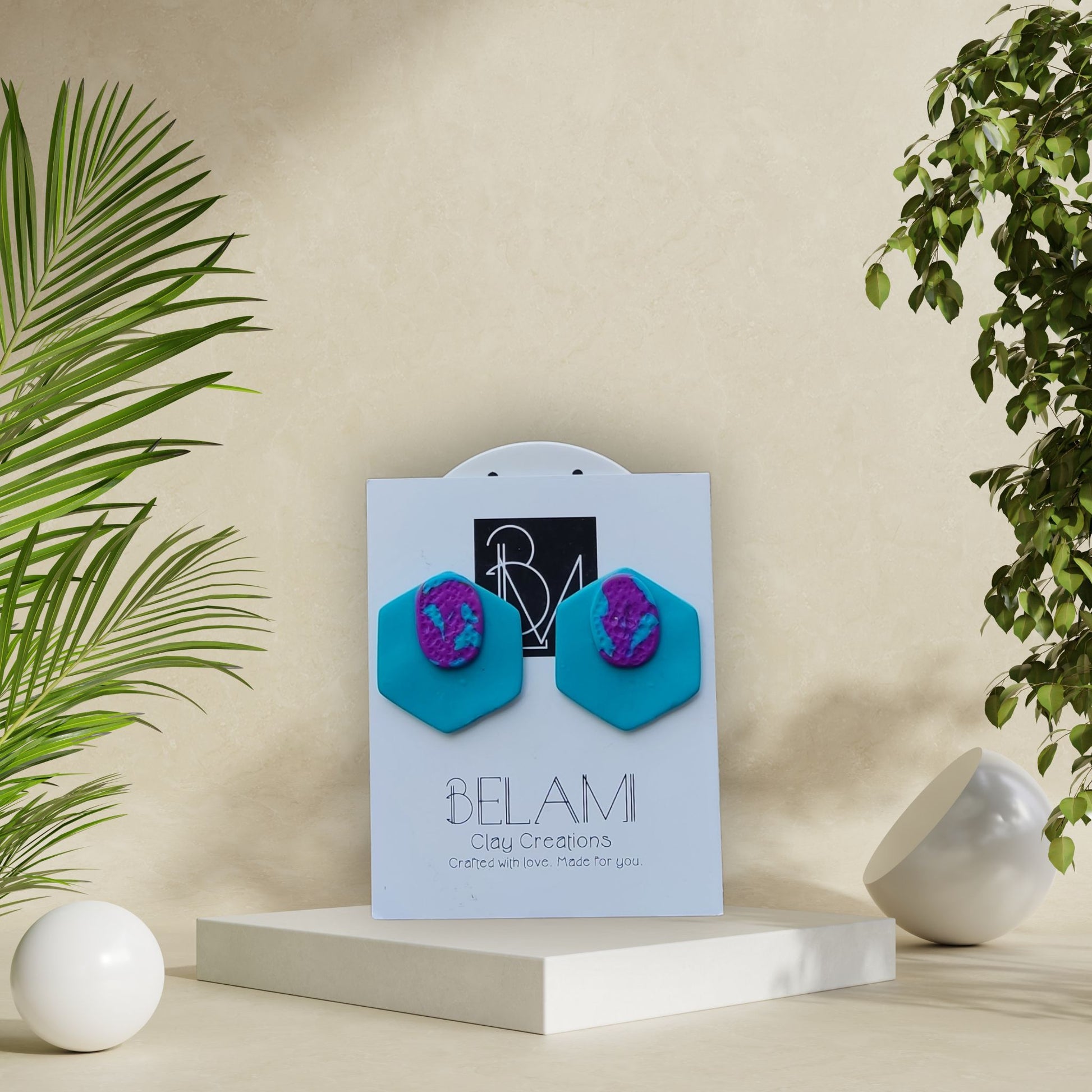 Τολμηρά, ζωντανά και εντυπωσιακά. Αυτά τα γεωμετρικά studs σε εξάγωνο σχήμα συνδυάζουν τυρκουάζ βάση με ανάγλυφες μωβ λεπτομέρειες, δημιουργώντας ένα statement κομμάτι για τις καλοκαιρινές σας εμφανίσεις.