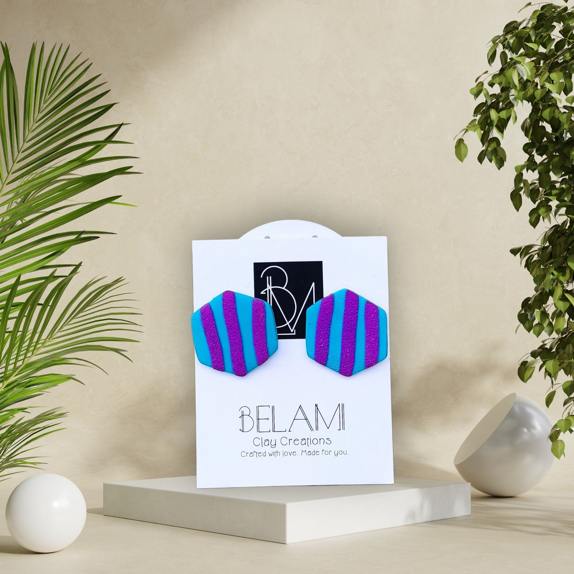 Γεωμετρικά χειροποίητα σκουλαρίκια από πολυμερικό πηλό με εναλλασσόμενες ρίγες σε έντονο μωβ και κυανό. Ανάλαφρα αλλά γεμάτα ένταση — ιδανικά για όσους θέλουν να ξεχωρίζουν.