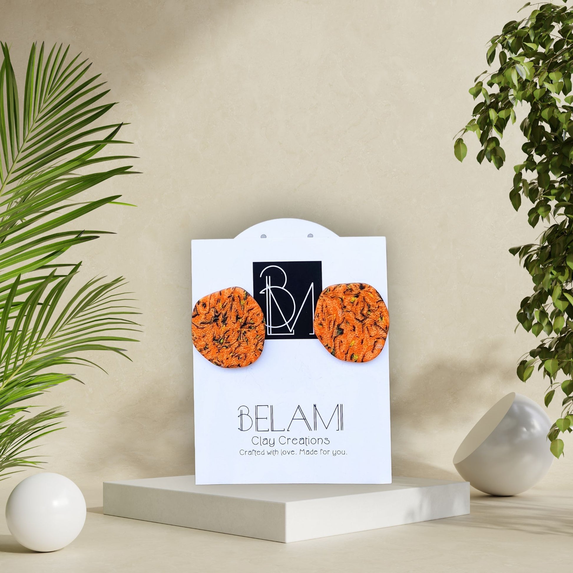 Στρογγυλά σκουλαρίκια από πολυμερικό πηλό σε καμένη πορτοκαλί απόχρωση, με ανάγλυφη χειροποίητη υφή. Γήινα και εκρηκτικά — για εμφανίσεις με ενέργεια.