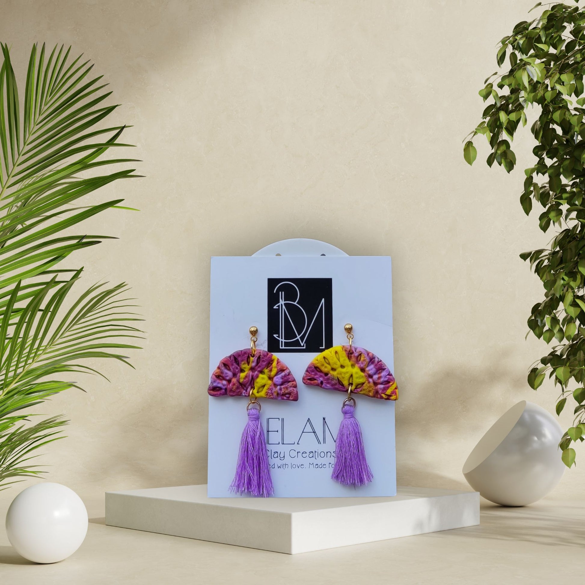 Έντονα, ανάγλυφα και γεμάτα ενέργεια! Αυτά τα σκουλαρίκια σε σχήμα βεντάλιας, με χρώματα μωβ και κίτρινο, συνδυάζονται με απαλή λιλά φούντα — μια καλοκαιρινή γιορτή σε κάθε σου εμφάνιση.