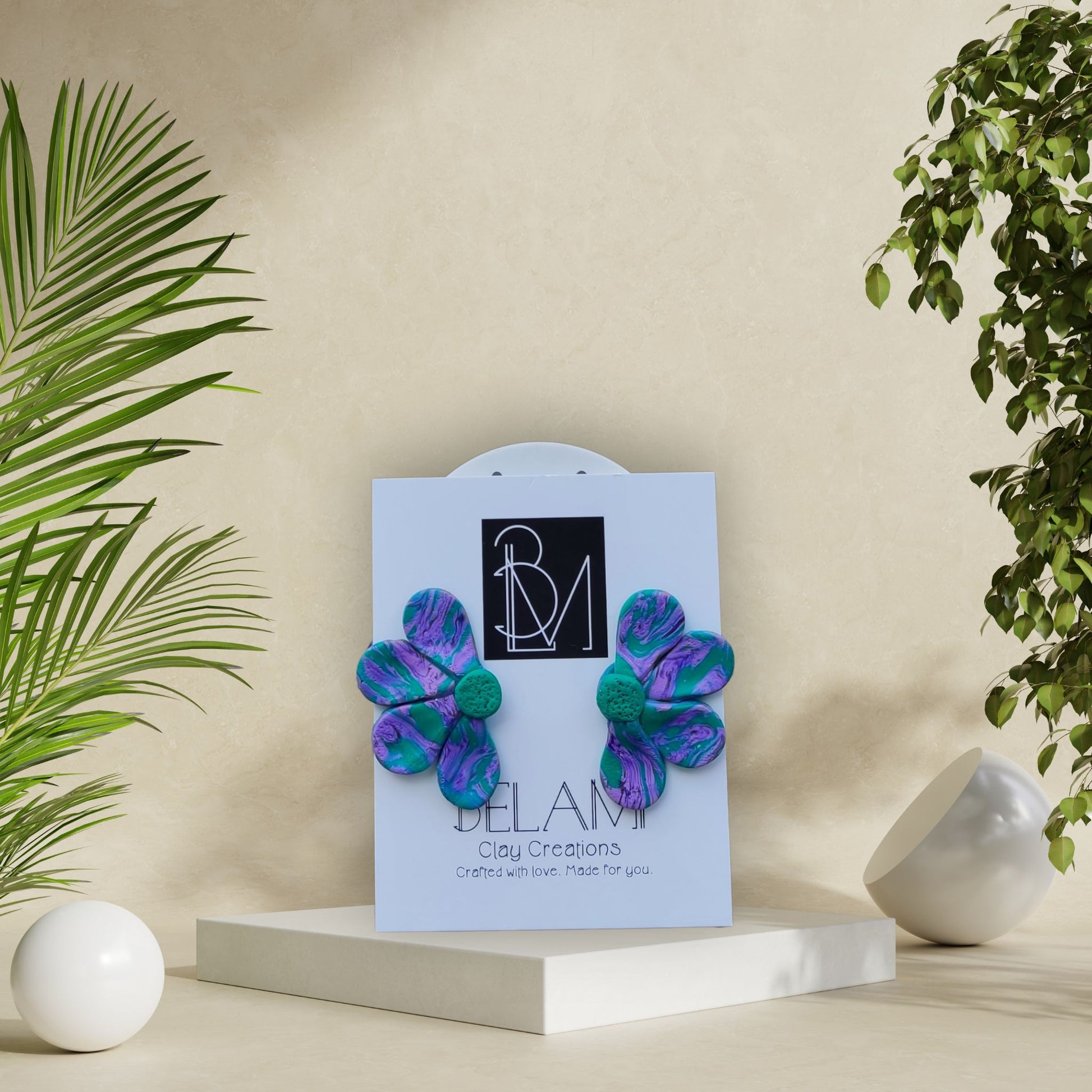 Έντονα και σε πλήρη άνθιση! Αυτά τα oversized σκουλαρίκια σε σχήμα λουλουδιού είναι φτιαγμένα πέταλο-πέταλο με swirl pattern σε μωβ και τιρκουάζ, και στο κέντρο τους έχουν ανάγλυφη πράσινη υφή. Ένα μικρό έργο τέχνης για τα αυτιά σου.