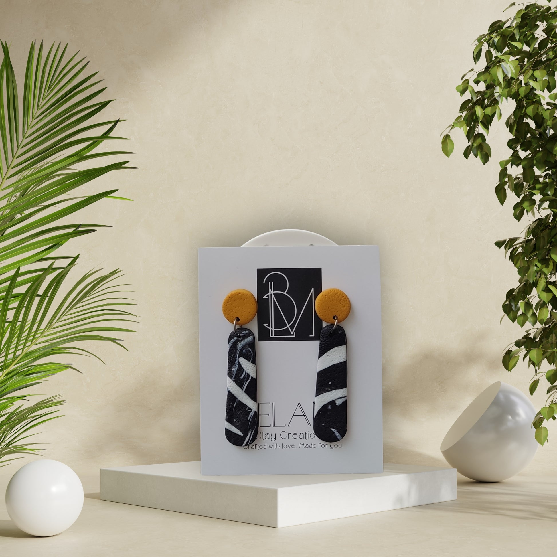 Τα GOLDEN WAVE σκουλαρίκια συνδυάζουν το μουσταρδί με το λευκό–μαύρο σε ένα μοντέρνο abstract design. Ένας ζεστός χρυσός κύκλος στηρίζει μακρόστενα μαύρα στοιχεία με λευκά κυματιστά μοτίβα. Ελαφριά αλλά εντυπωσιακά, φέρνουν ισορροπία γης και αντίθεσης στις χειμερινές εμφανίσεις.