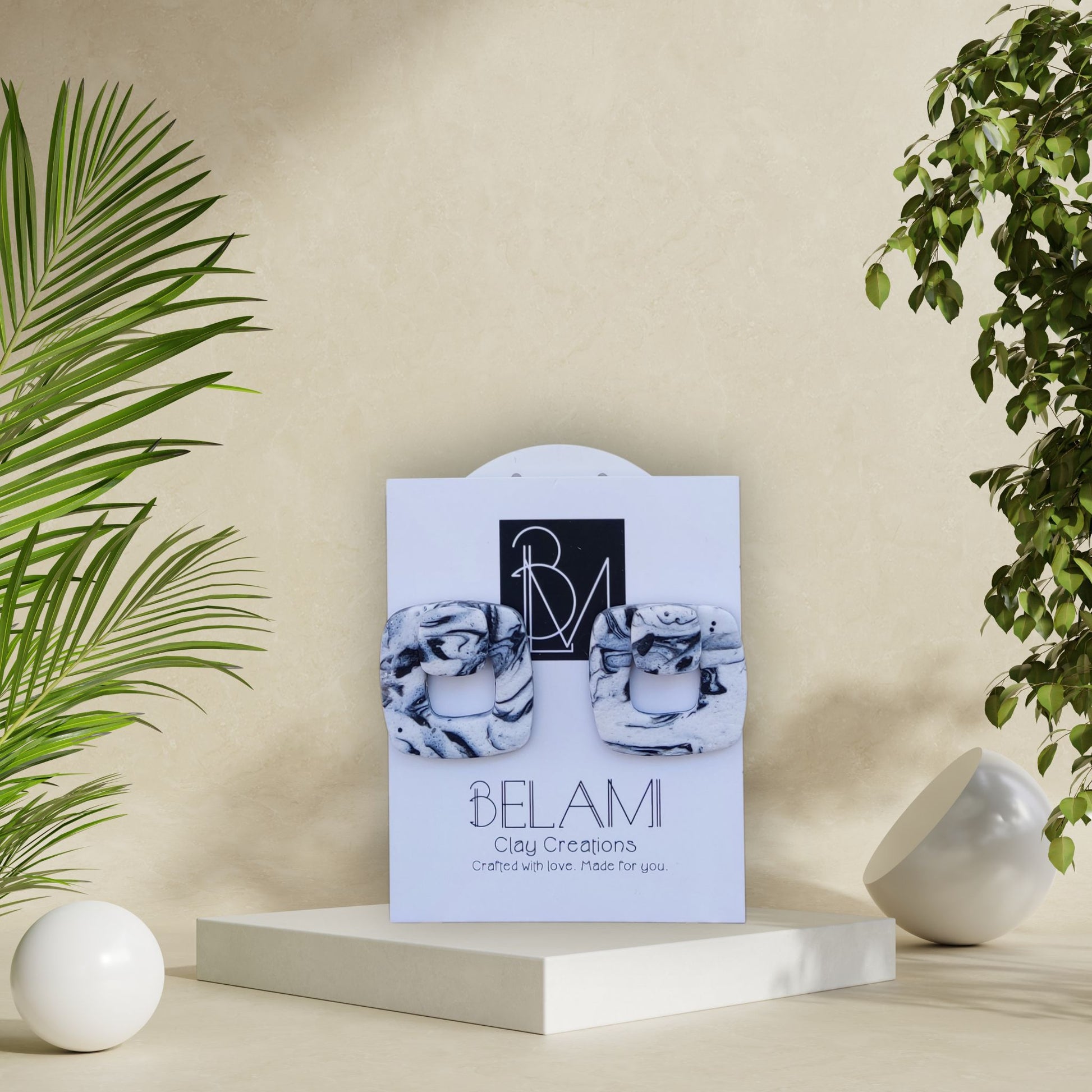 Αυτά τα εντυπωσιακά σκουλαρίκια σε τετράγωνο σχήμα διαθέτουν μοναδική swirl υφή σε λευκό και μαύρο — καθεμιά απόχρωση είναι δημιουργημένη στο χέρι, κάνοντας κάθε ζευγάρι ξεχωριστό.