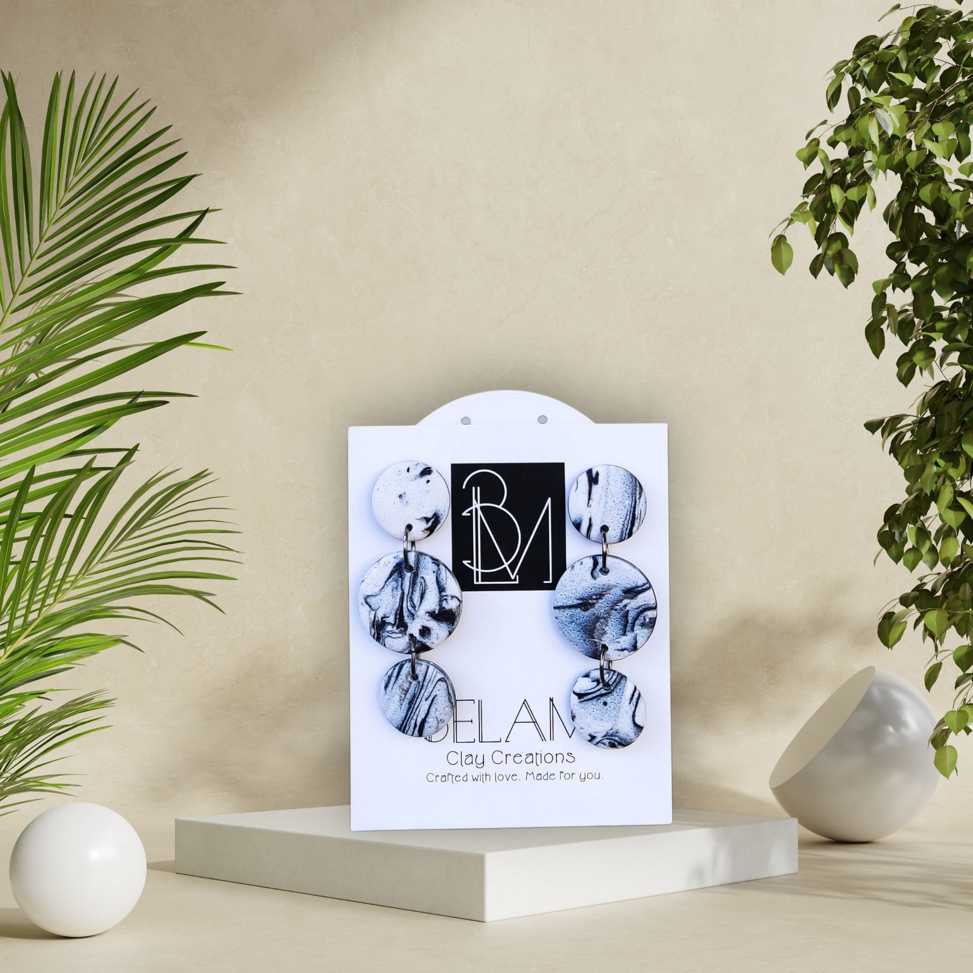 Αυτά τα statement σκουλαρίκια αποτελούνται από κυκλικά στοιχεία πολυμερικού πηλού με ρευστό μαρμάρινο σχέδιο — κάθε ζευγάρι εντελώς μοναδικό.