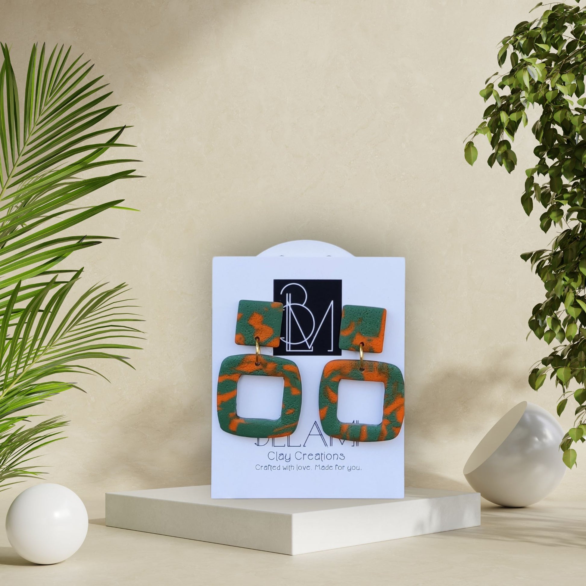 Άγρια μοτίβα με τολμηρή γεωμετρία. Τα σκουλαρίκια JUNGLE CAMO συνδυάζουν αφηρημένα swirl σε χακί και πορτοκαλί αποχρώσεις με τετράγωνο κρεμαστό σχέδιο, δημιουργώντας ένα statement γεμάτο κίνηση και χρώμα.