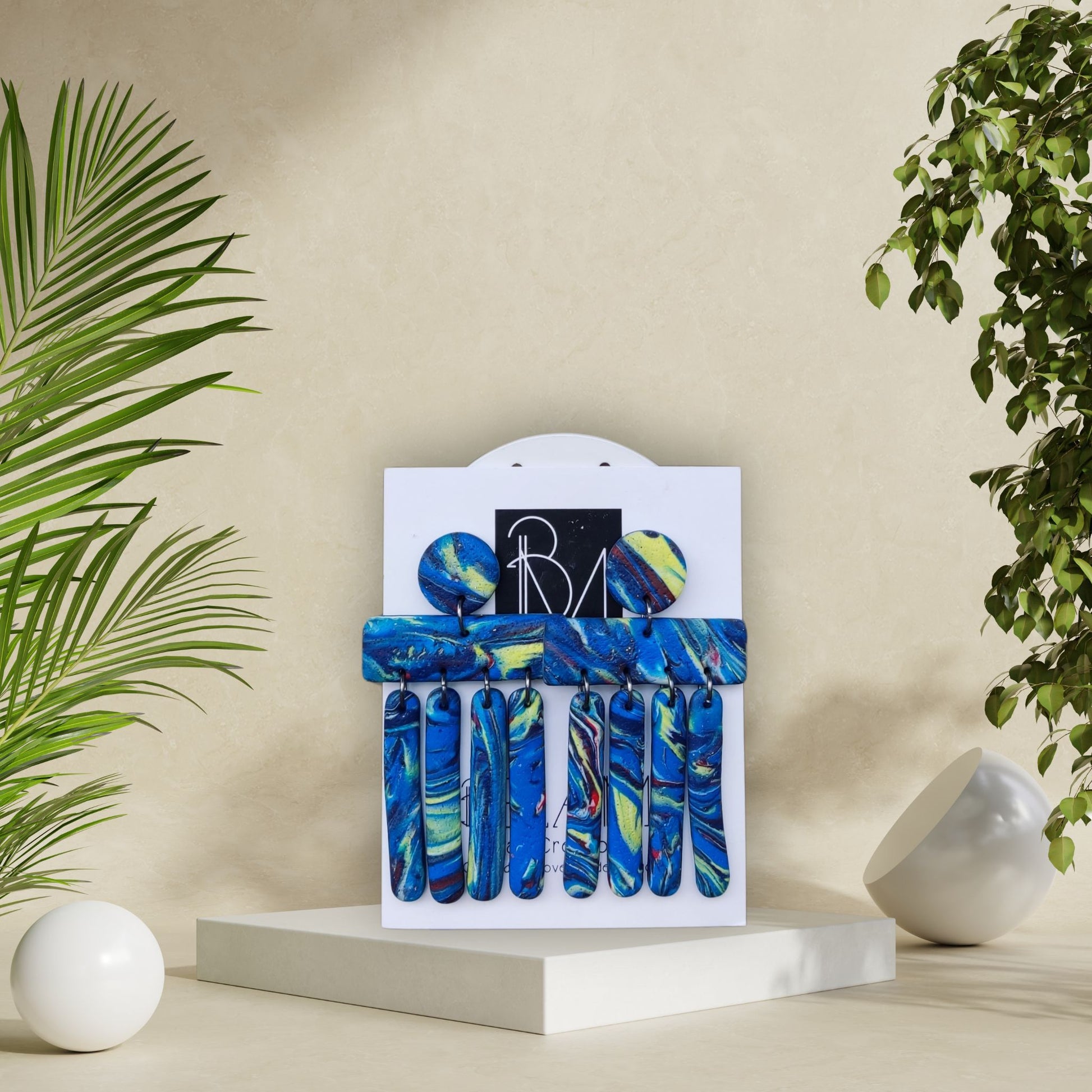 Εντυπωσιακά και δυναμικά, αυτά τα σκουλαρίκια με μακριά fringe στοιχεία και καλλιτεχνικό swirl σε μπλε και κίτρινο ξεχωρίζουν σε κάθε εμφάνιση.