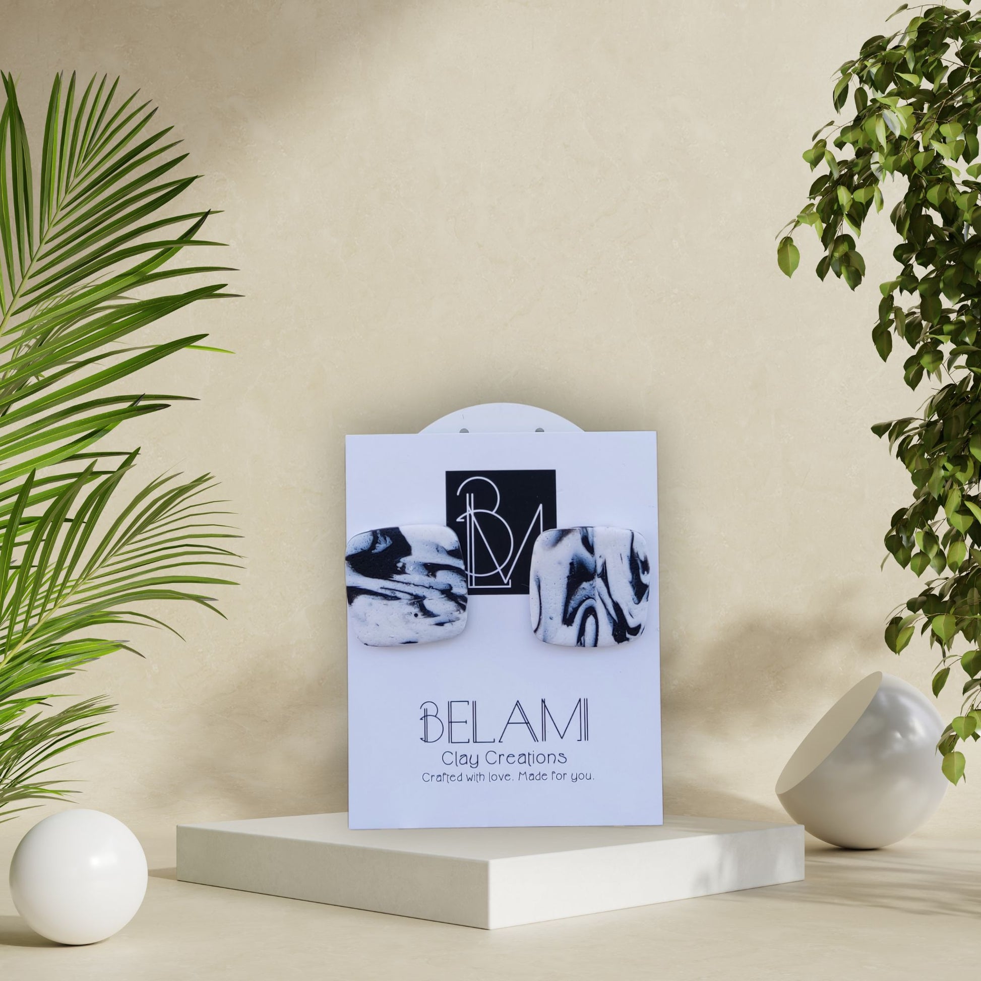 Αυτά τα τετράγωνα καρφωτά σκουλαρίκια σε ασπρόμαυρη swirl υφή αποπνέουν κομψότητα με καλλιτεχνική διάθεση.