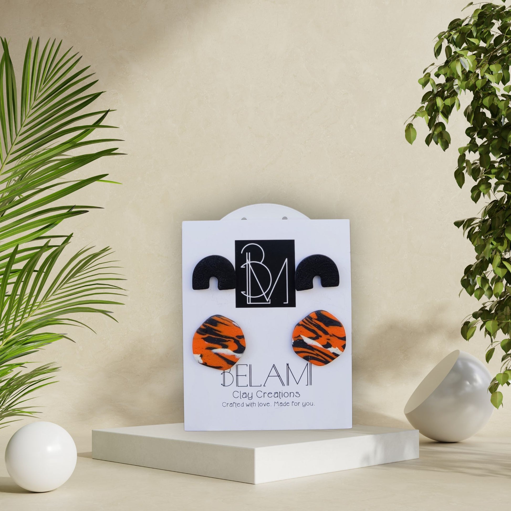 Το σετ περιλαμβάνει δύο χειροποίητα ζευγάρια σκουλαρίκια: γλυπτά μαύρα με ημικύκλιο και statement κομμάτια με τιγρέ μοτίβο σε πορτοκαλί-μαύρο.