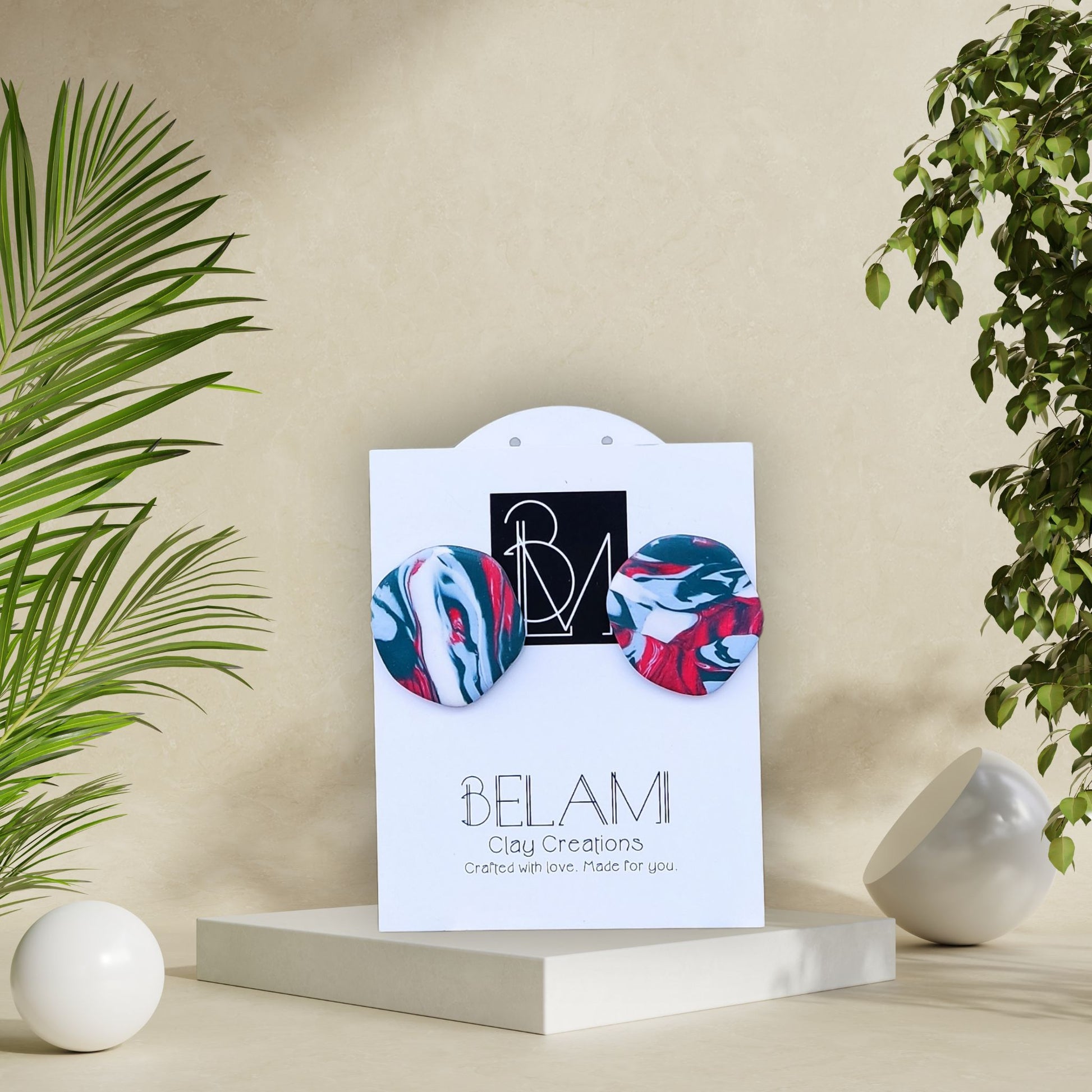 Χειροποίητα σκουλαρίκια από πολυμερικό πηλό με μαρμαρένιο μοτίβο σε αποχρώσεις του μπλε, του κόκκινου και του λευκού. Κυκλικός σχεδιασμός με κούμπωμα από ανοξείδωτο ατσάλι. Ανάλαφρα, έντονα και γεμάτα ενέργεια – για εμφανίσεις που ξεχωρίζουν.