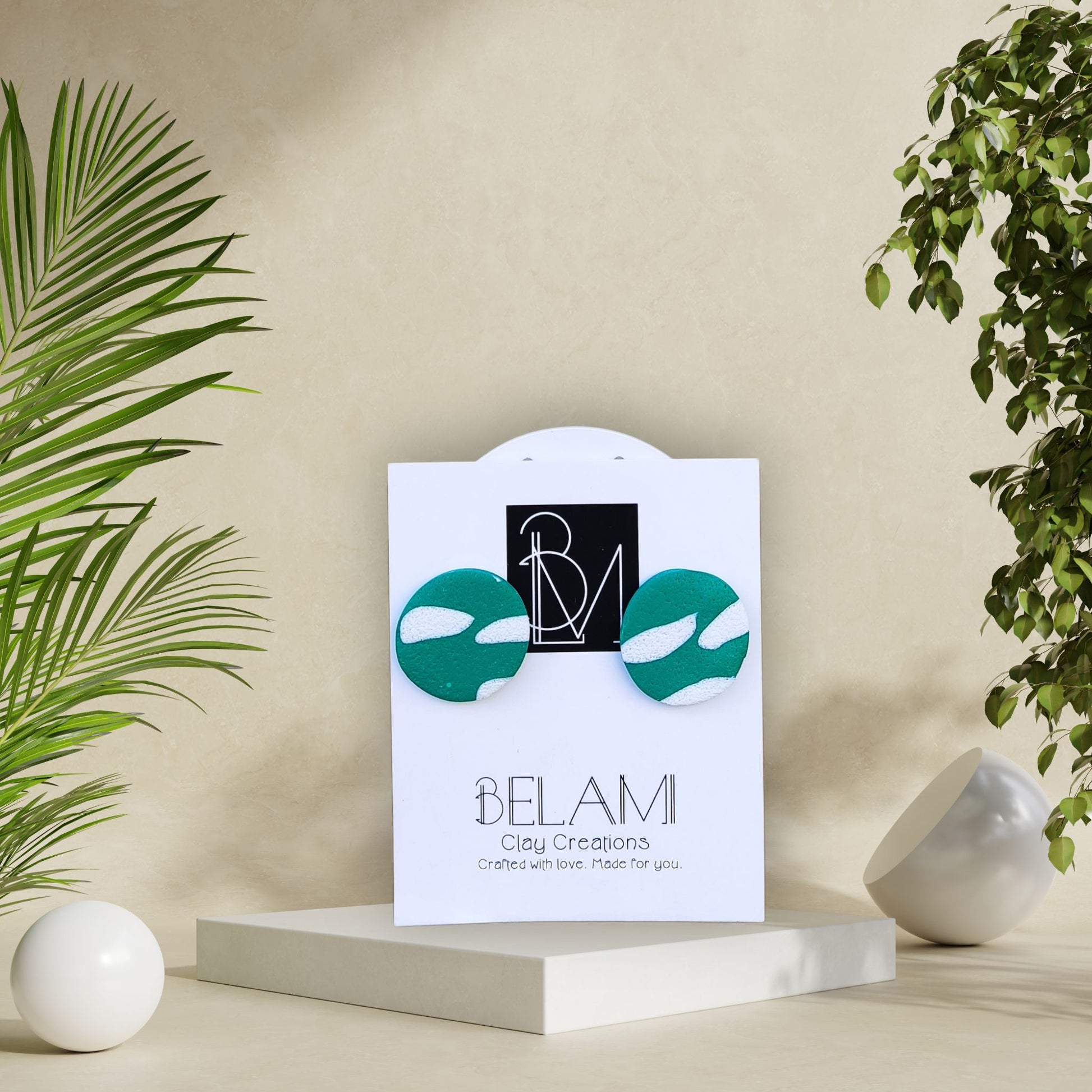 Ανάλαφρα σκουλαρίκια από πολυμερικό πηλό με κυκλικό σχήμα, πράσινη βάση και λευκά αφηρημένα μοτίβα σαν παιχνίδι φωτός πάνω σε φύλλα.