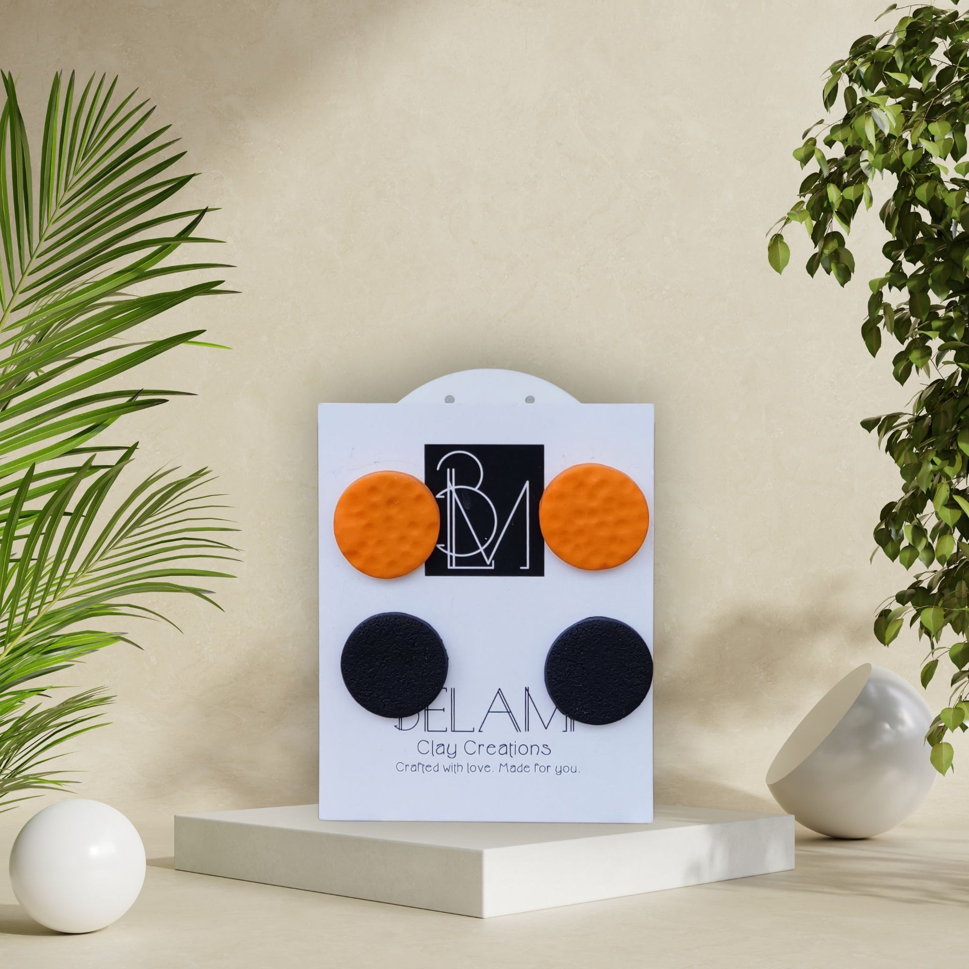 Ένα δυνατό combo με σκουλαρίκια σε έντονα χρώματα και καθαρές φόρμες. Ένα ζευγάρι σε πορτοκαλί με μαλακή υφή και το άλλο σε μαύρο με ματ φινίρισμα. Φοριούνται μαζί ή ξεχωριστά.