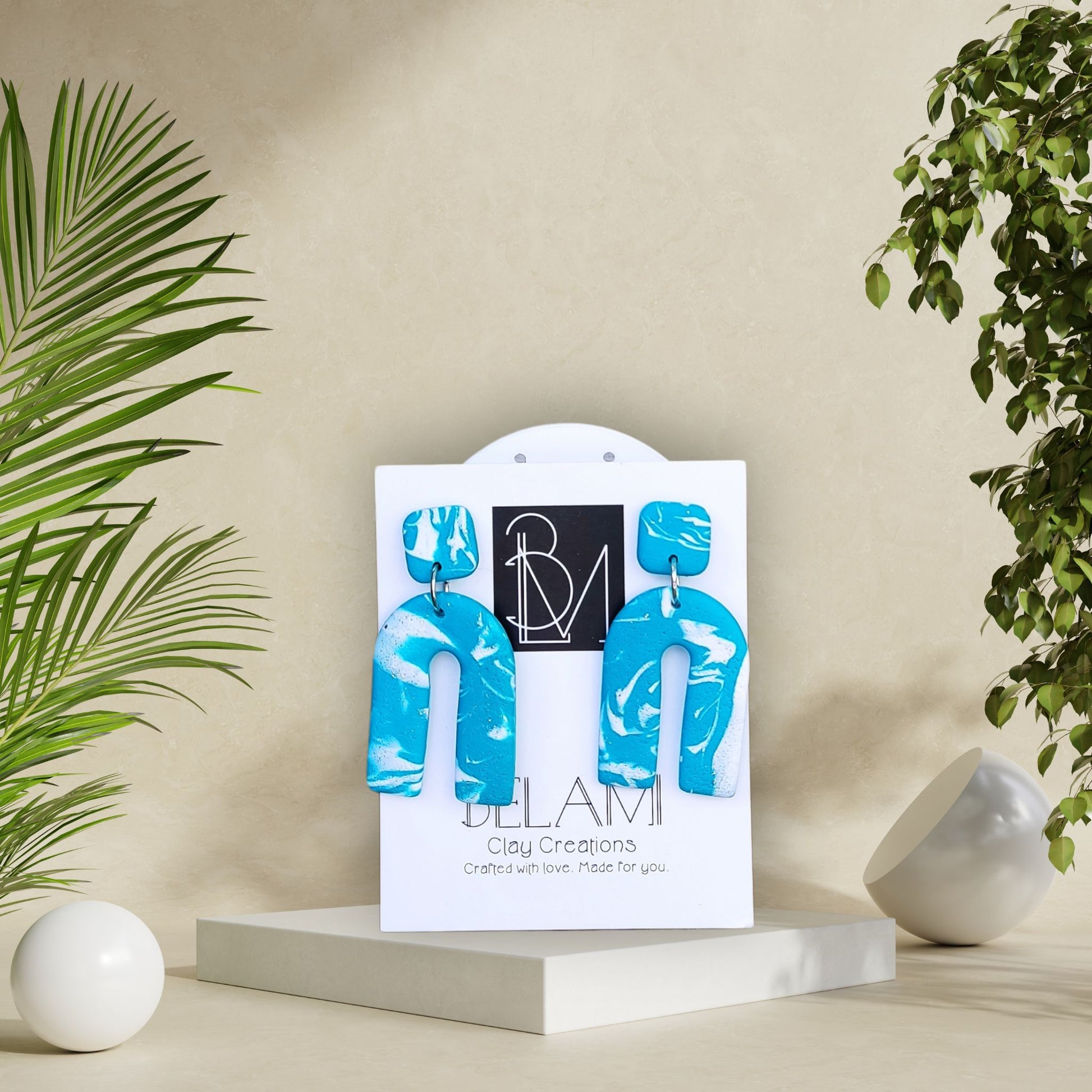 Χειροποίητα σκουλαρίκια από πολυμερικό πηλό σε γεωμετρικό σχήμα αψίδας, με τιρκουάζ βάση και ανάλαφρους λευκούς στροβιλισμούς. Μοντέρνα, ανάλαφρα και απόλυτα καλοκαιρινά.